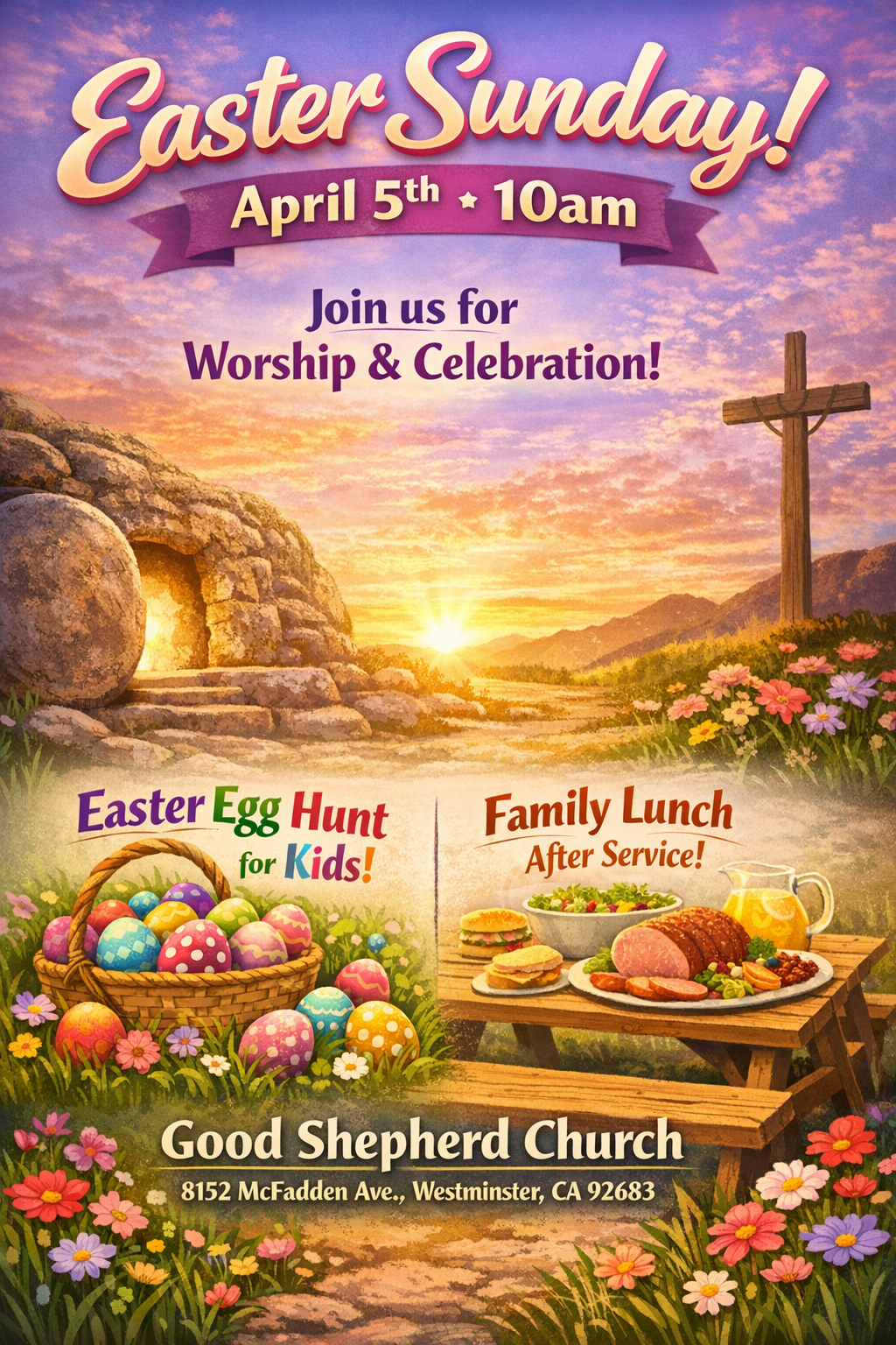 Easter Service & Egg Hunt 22 hours ago by Good Shepherd United Methodist Church Calendar Add to Calendar Add to Timely Calendar Add to Google Add to Outlook Add to Apple Calendar Add to other calendar Export to XML When: 04/05/2026 @ 10:00 am – 1:00 pm 2026-04-05T10:00:00-07:00 2026-04-05T13:00:00-07:00